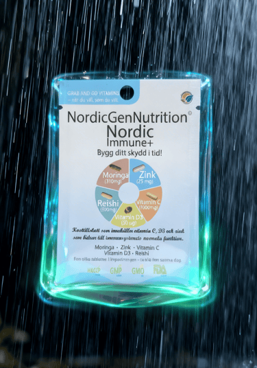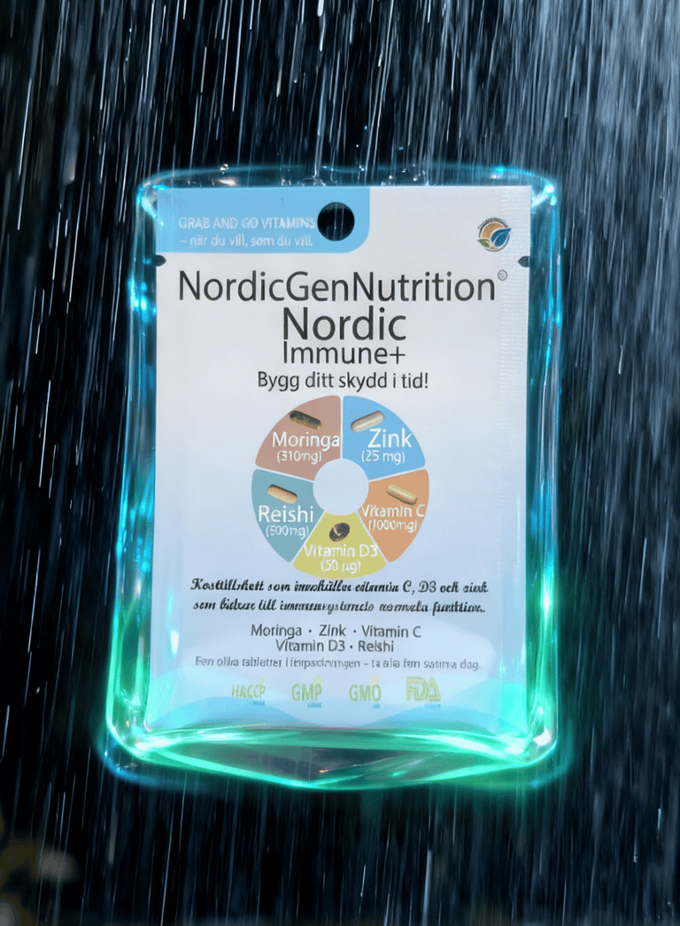 NordicGenNutrition Immune+ är din dagliga sköld – en komplett grab-and-go-påse med fem noga utvalda tabletter som stöttar immunförsvaret när du behöver det som mest.