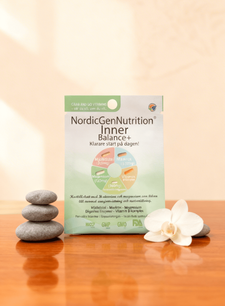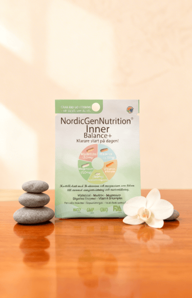 NordicGenNutrition Inner Balance+ är din grab-and-go-lösning för matsmältning och välmående. Fem tabletter – noggrant utvalda för att ge magen det den behöver för att komma tillbaka i balans.